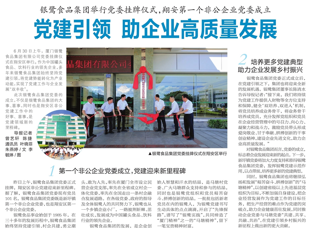 銀鷺食品集團(tuán)舉行黨委掛牌儀式,翔安第一個(gè)非公企業(yè)黨委成立